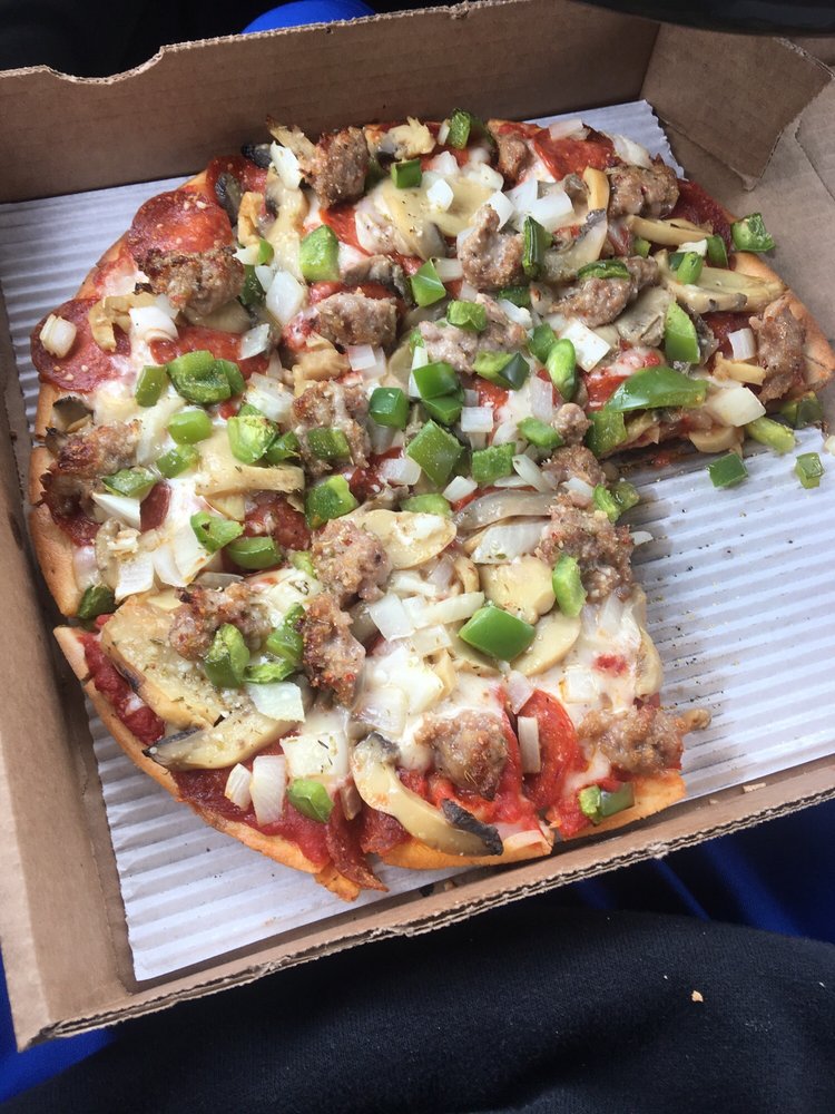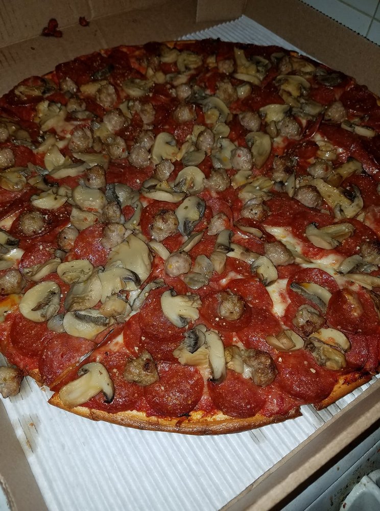 Cheese, pepperoni, mushroom, onion, green pepper, sausage.