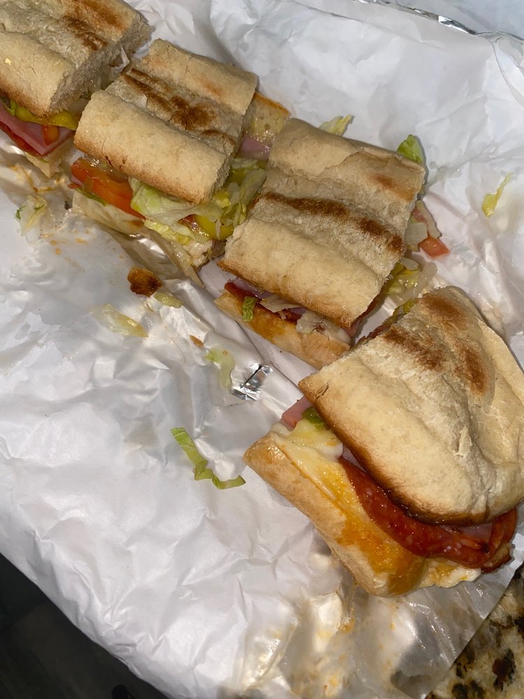Ham, cheese pepperoni, tomato, onion, hot pepper, lettuce, and Italian dressing on a french roll.